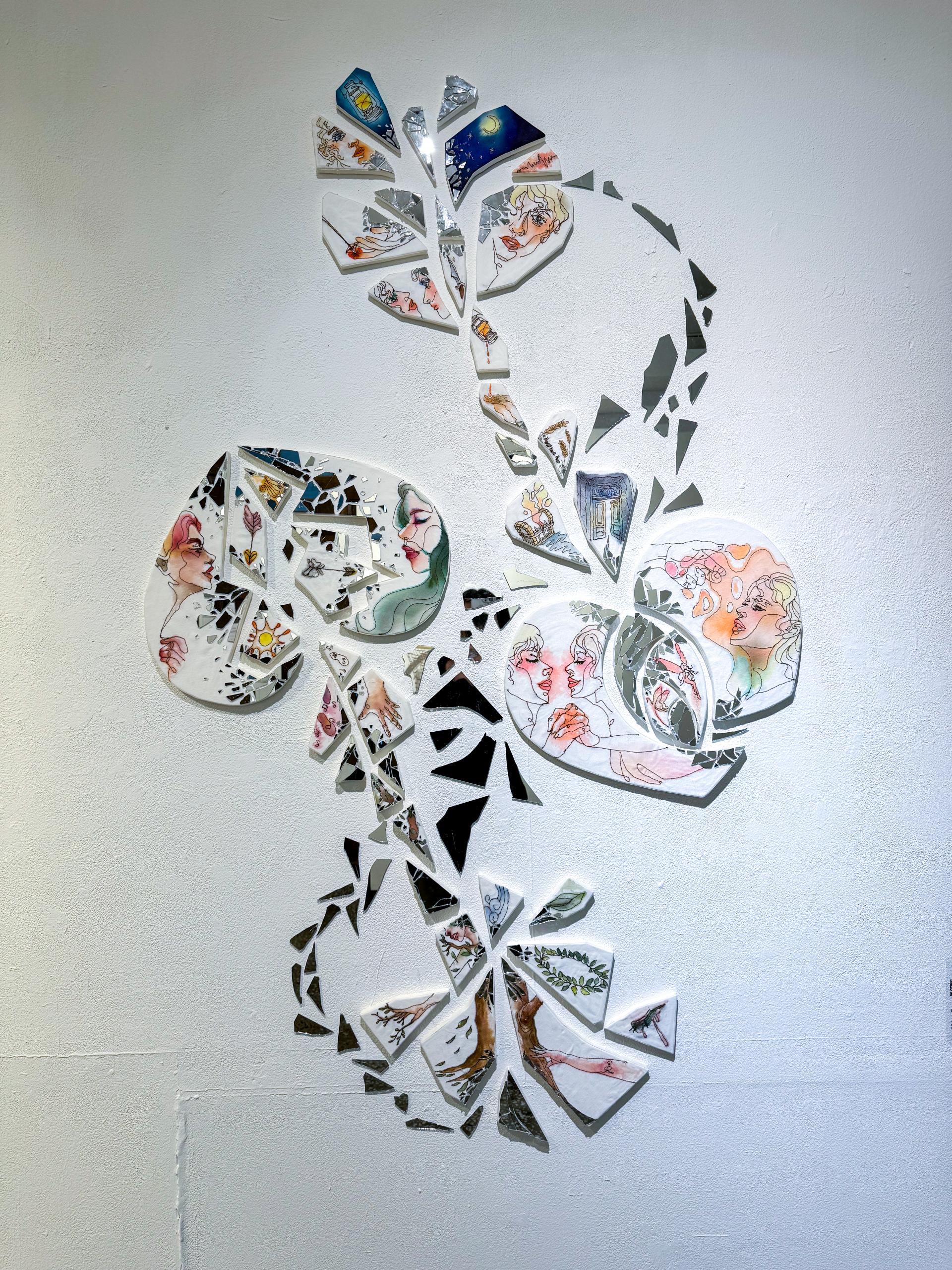 그리스신화에서 사랑의 신인 에로스에 의해 발생되는 두가지 이야기를 담았습니다. 하나는 에로스의 금화살로 인해 사랑이 생겨나고 이루어지는 이야기를, 다른 하나는 에로스의 납화살로 인해 사랑을 거부하고 비극적인 결말로 이어지는 이야기를 기계자수를 통한 일러스트로 표현했습니다. 에로스의 화살은 눈에 보이지 않는다는 서술이 있는데 저는 이것을 화살이 몸에 닿을 때 산산이 부서져 그 화살 조각들이 마음 속으로 스며든다고 해석하였습니다. 그래서 화살이라는 직접적인 형태를 이루면서도 조각조각 부서진 형태로 표현하였습니다. 또한 사랑을 이루고, 이뤄지지 않는 것은 사랑이라는 감정이 어느 방향으로 가는지에 따라 감정의 변화로 인해 벌어지는 결과라고 생각했기에 화살의 방향 또한 정반대로 설정했으며, 그 감정 또한 일관되지 않고 변화할 수 있기 때문에 화살을 잇는 동선을 추가하여 감정의 변화를 나타내었습니다.