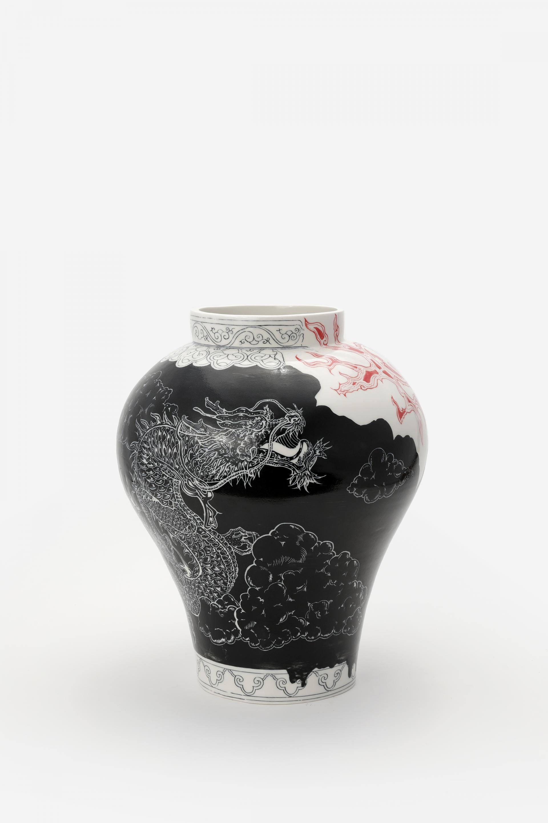 ‘운룡도’라는 민화에서 영감을 받은 작품으로, 두 마리의 용이 여의주를 갈망하며 하늘로 승천하는 모습을 도예적으로 재해석하였습니다.
