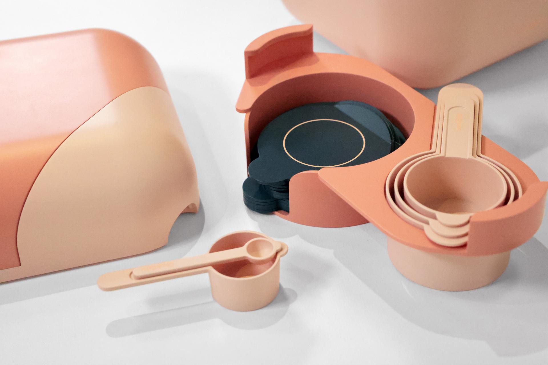 쿠키 재료들을 준비할 수 있는 버터 박스부터, 일반적인 쿠키 레시피에 최적화된 계량컵, 주위의 청결과 정리에 도움을 줄 체와 정리 합, 그리고 반죽을 구울 때 발생하는 쿠키만의 특징을 고려한 트레이와 식힘 홀, 마지막으로 완성된 쿠키를 식탁에 올릴 때 사용하게 될 접시까지 쿠키 베이킹의 전 과정을 생각하고 디자인한 8개의 툴입니다.