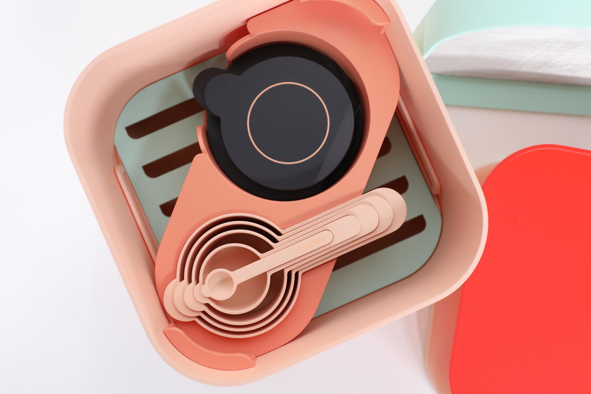 CookBite는 버터 박스, 계량컵, 체, 믹싱 박스, 트레이, 식힘 홀, 정리 합, 쿠키 접시로 총 8개의 툴이 담겨 있습니다.