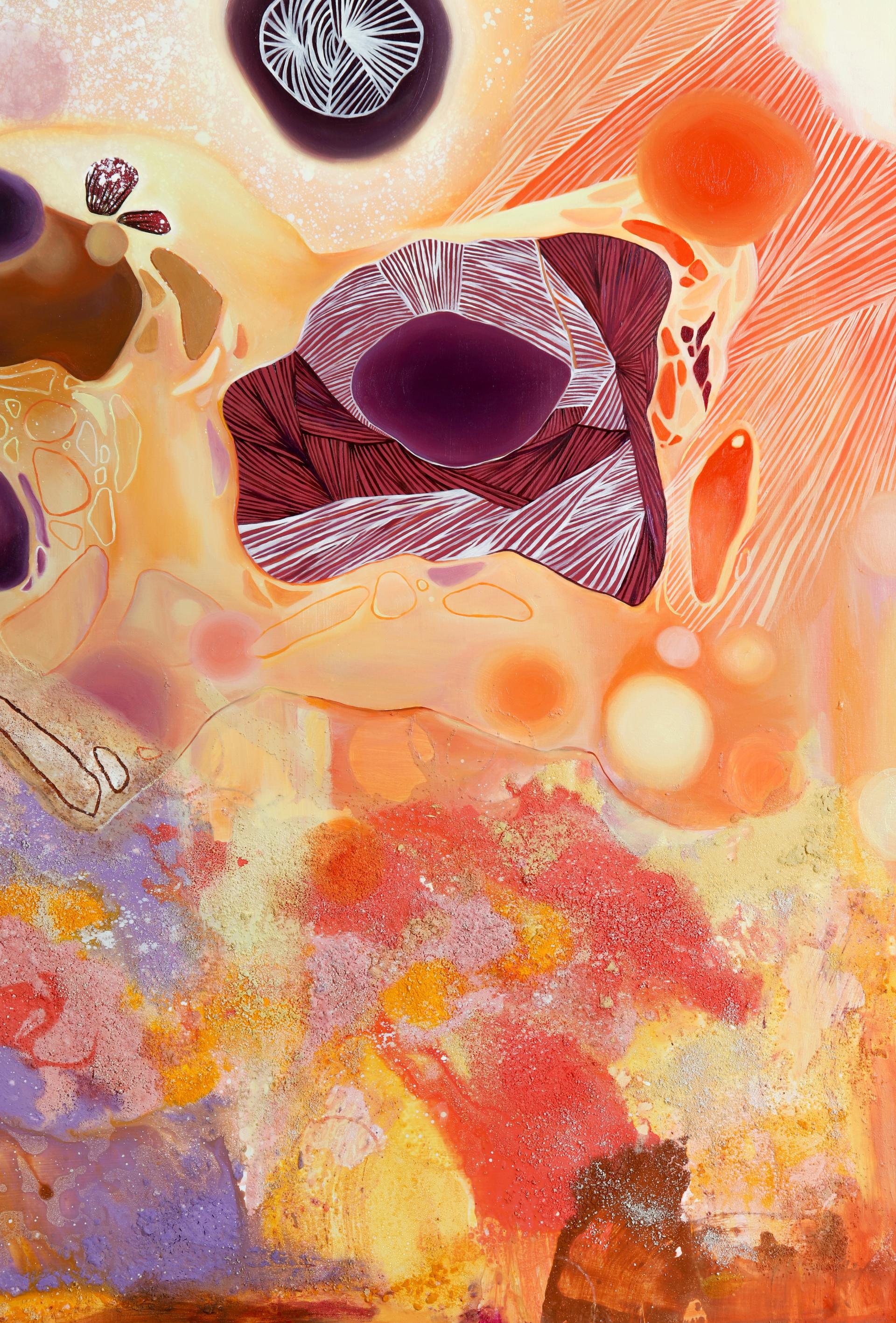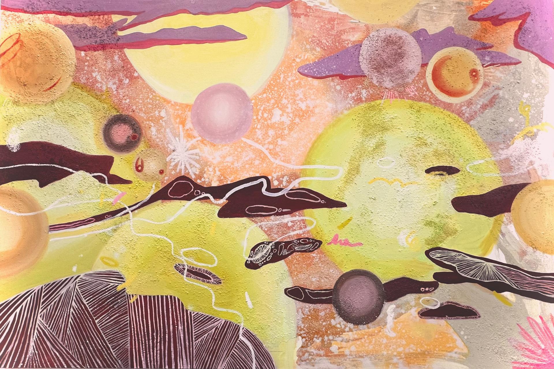제 작품은 '환각'을 주제로 제가 바라보는 세상을 표현합니다. 트라우마로 인해 생겼던 환각은 저에게 영감을 주는 매체입니다. 이를 바탕으로 당시에 느꼈던 아지랑이, 뿌옇게 앞을 가리던 불분명한 형체들을 추상적인 형태, 반복적 패턴, 작품 속 기법을 통해 나타냅니다. 작품 제목이 '환상'인 이유는 트라우마를 미화하며 극복하려 했던 저의 심리를 대변합니다. 작품을 통해 대중들에게 아팠던 과거에 질문을 던지고, 저의 치유를 공유합니다.