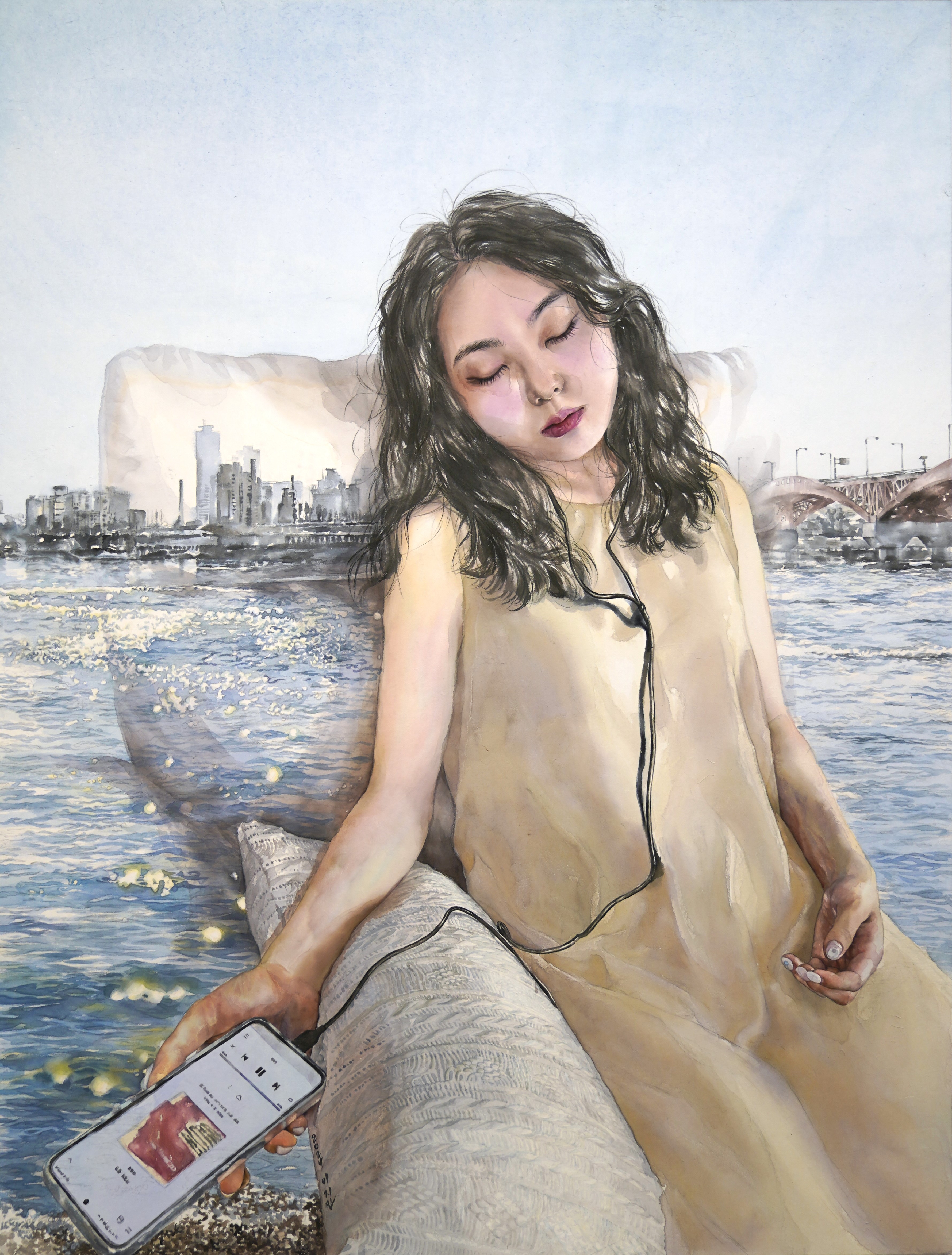 핸드폰에 이어폰을 연결해 눈을 감고 음악을 들으며 무의식의 경계에 들어간다.