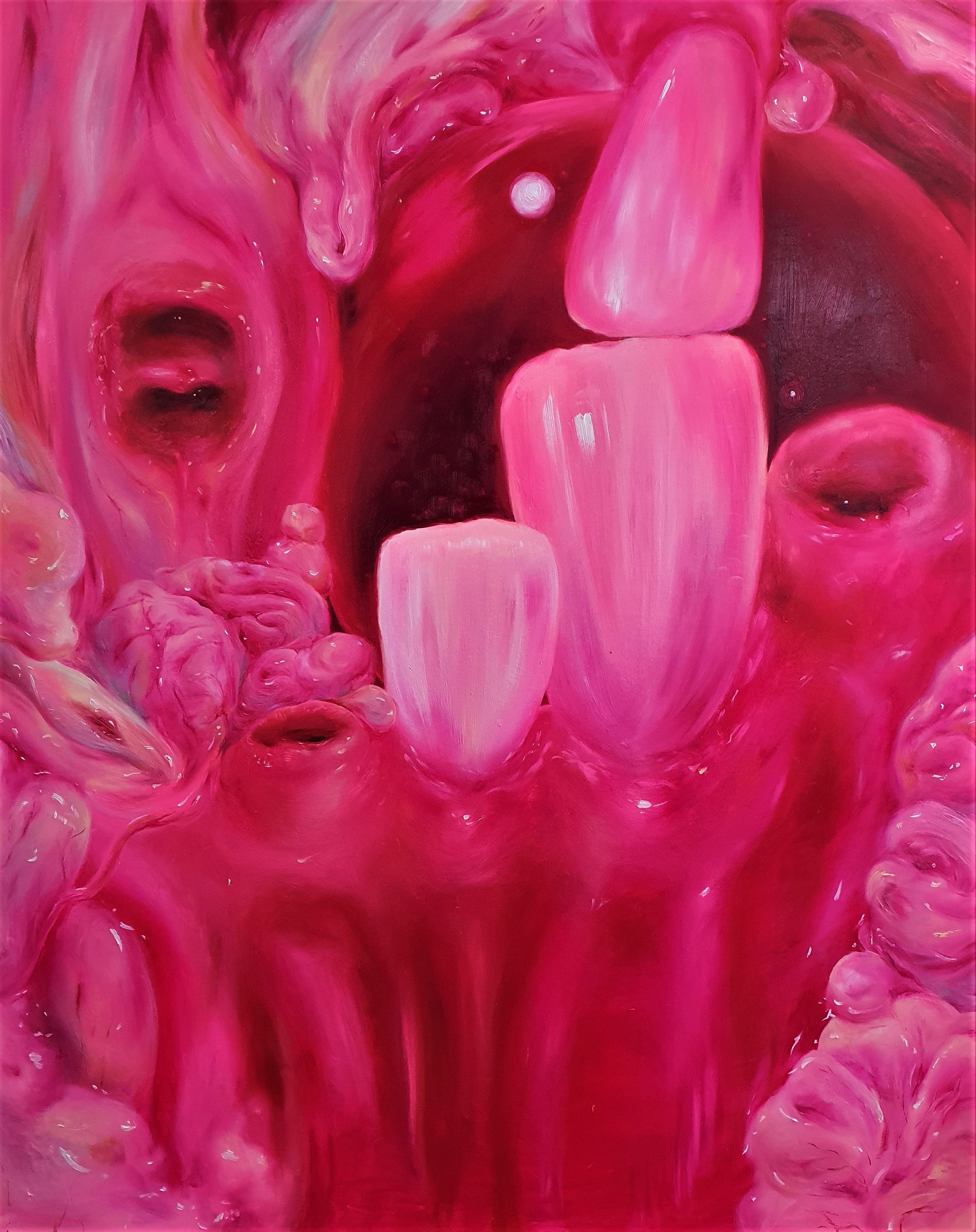 <우상> 중, <우상-무대> 시리즈 에서는 현 사회의 젠더 이슈들, 억압, 관념, 방관 등의 키워드들이 내포되어 있다. 사회에서 추구하는 여성과 남성의 이상적인 이미지들이 있고, 우리는 우상과 같은 존재들을 필요로 해왔으며 기호에 따라 그들에게 수많은 조건들에 부합하도록 하였다. 이들은 모두 우리 사회의 쿠마리와 같다. <우상-무대> 시리즈에서 반복되고 있는 핑크색은 여성성 상징을 은유적으로 나타내고 있다. 어린 시절부터 특정 색과 그것에 대한 관념에 오랫동안 노출되면서 그것이 자연스럽게 받아들여지게 되는, 의지와 상관없이 핑크색의 무대 위에 서게 되었던 강제성을 드러내고자 했다. 또한, 끊임없이 새로운 쿠마리가 생겨나듯 우리 사회의 우상들도 시간이 지나면 마치 유통기한이 임박한 상품들처럼 교체되는 것 같이 보였다. 그리고 그것은 끝없는 욕망 해소의 굴레와도 같아 보였다.