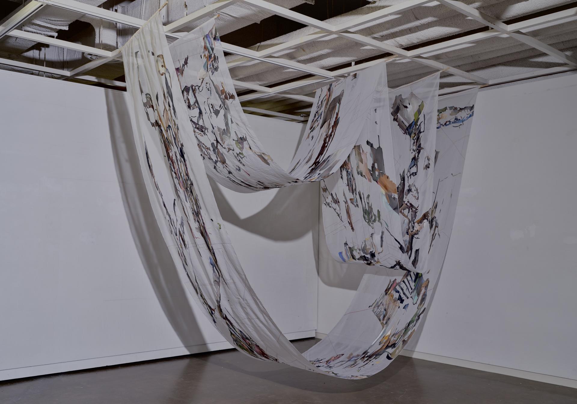 이 과정에서 둘 사이의 경계를 허물어, 가장 가까운 타자인 그녀를 통해 나 자신을 마주한다. 천장으로부터 길게 늘어진 반투명의 천은 서로 겹치고, 또 비치며 감정의 막을 만든다.