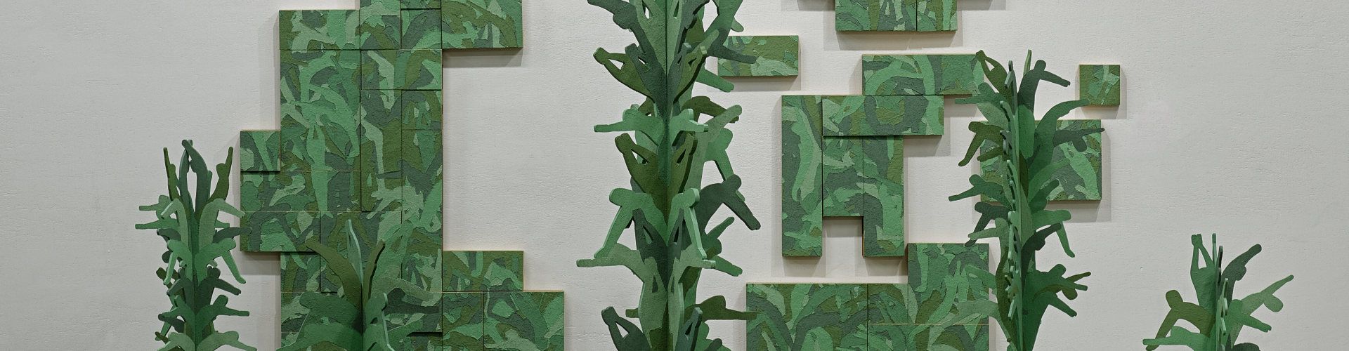 <긋기, 지우기, 뒤바꾸기, 넘나들기>는 인간 존재와 삶을 ‘풀’로, 세상을 ‘풀숲’으로 표현한다. 주재료는 톱밥으로, 평범하기 그지없는 부산물인 톱밥이 특별한 존재인 주산물이 되어 작업의 재료로 재생산되는 것은 평범함과 특별함의 경계를 흐트러뜨리는 지점이다.